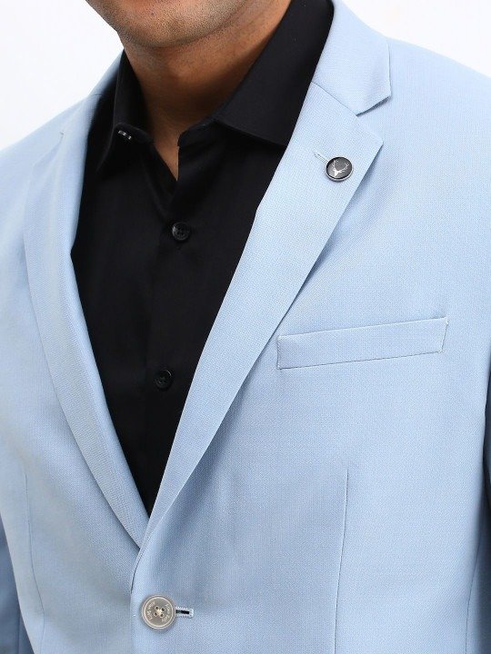 Blue solid slim-fit blazer, has a notched lapel collar, single-breasted with double button closures, long sleeves, one welt pocket, and two flap pockets, and a double-vented back hem